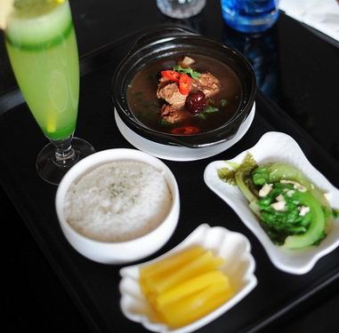 ????這道美食用藥材、大蒜和香料,加上豬肉骨烹煮而成,食用時配以米飯和辣椒黑醬油。它是大眾的早餐和夜宵。去新加坡,要想吃到原汁原味的肉骨茶,應該去唐人街牛車水的大排擋。茶客入座,店主便端上熱氣騰騰的大碗鮮湯,碗中有五六塊排骨,加一碗香噴噴的白米飯,還有一盤切成寸把長的油條,茶客根據各自口味,可加入胡椒粉、醋、鹽等調味品。吃完一大碗肉骨,接著是一小盅潮州的功夫茶,茶杯極小,泡的是很濃微帶苦味的普洱茶,而喝起來卻是滋味濃醇,馨香入肺。
