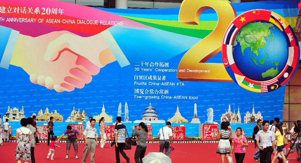 ??? 10月23日,在南寧國際會展中心,人們在慶祝中國-東盟建立對話關系20周年的宣傳畫前駐足。今年是中國與東盟建立對話關系20周年。20年來,中國東盟雙方貿易額從1991年的不足100億美元,上升到2010年的將近3000億美元,年均增長20%以上。中國已成為東盟最大貿易伙伴,今年4月以來,東盟超過日本,成為中國的第三大貿易伙伴。中國和東盟國家相互合作,在多領域實現共贏。新華社記者 黃孝邦 攝