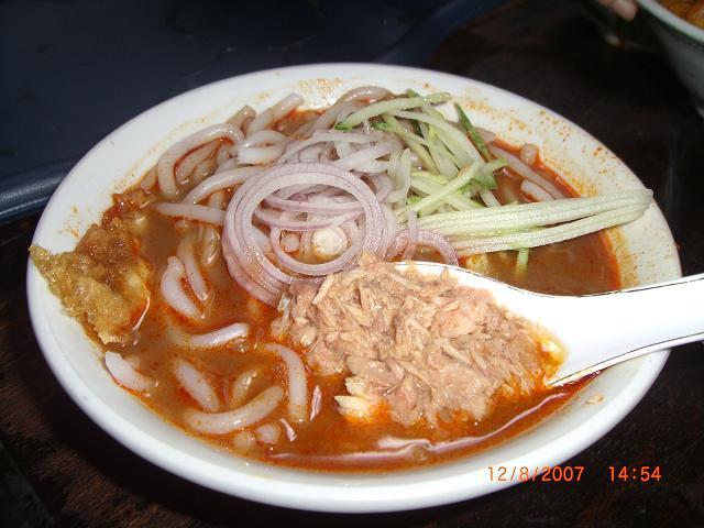 說到AsamLaksa,最出名莫過于馬來西亞的檳城了。AsamLaksa的湯汁是由沙丁魚所熬成的。湯汁里還會放一些洋蔥、黃梨、青瓜等。Asam Laksa是一種帶有一點酸酸辣辣的湯面。個人認為,味道不太適合中國口味。
